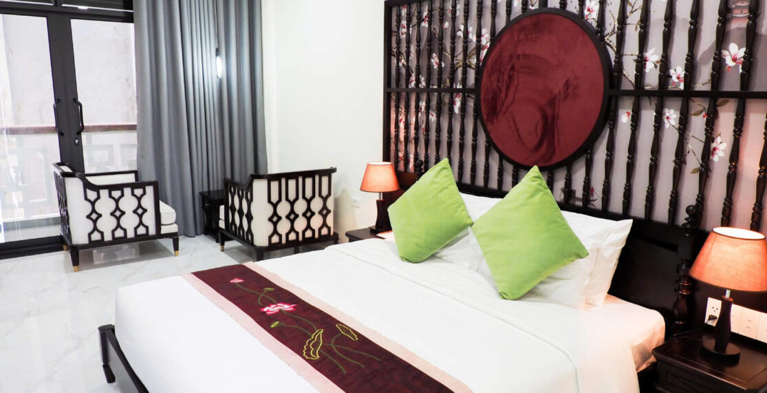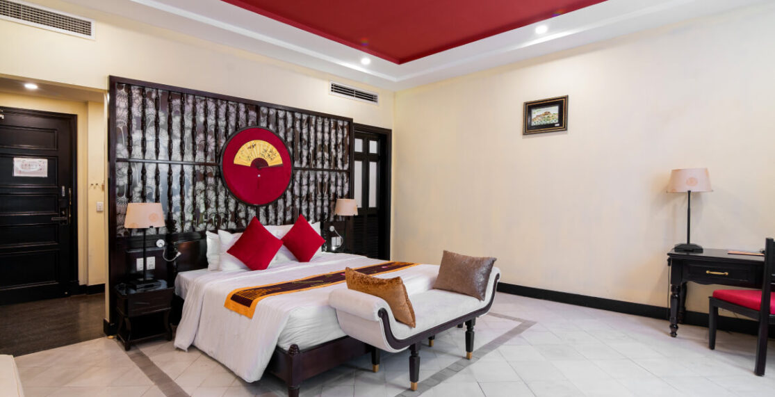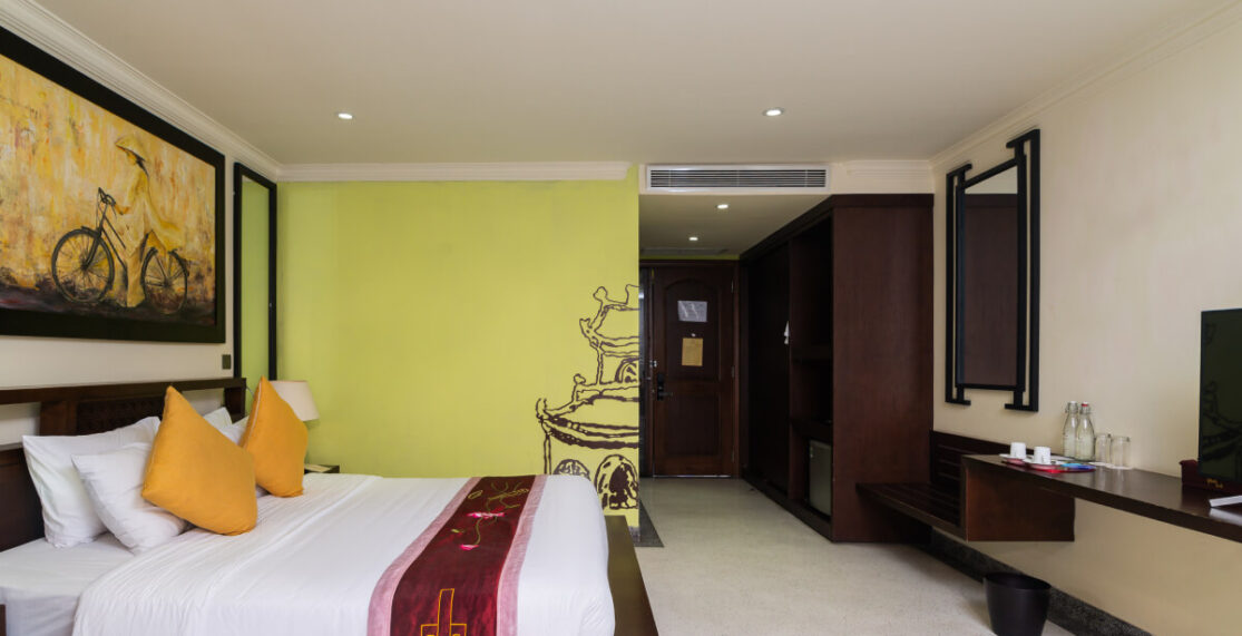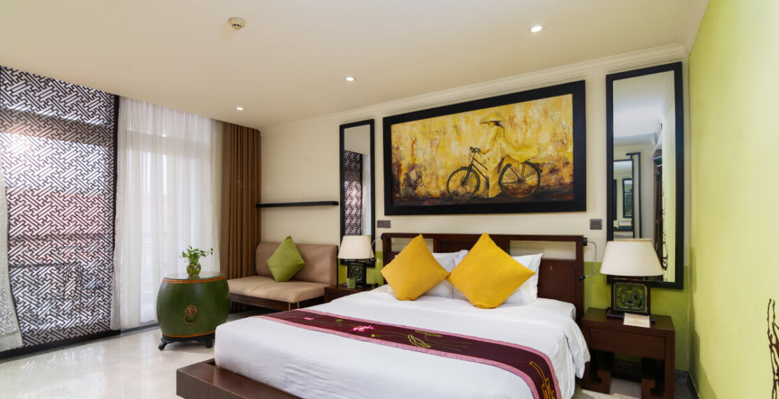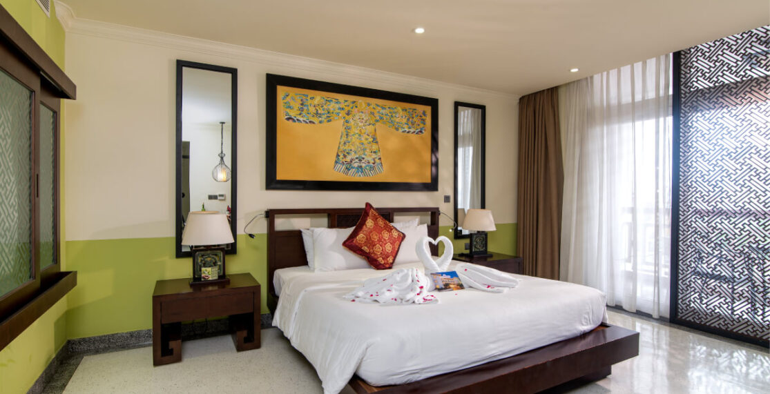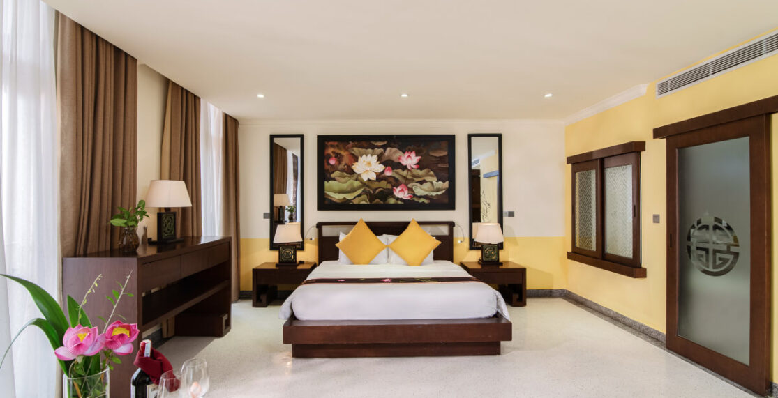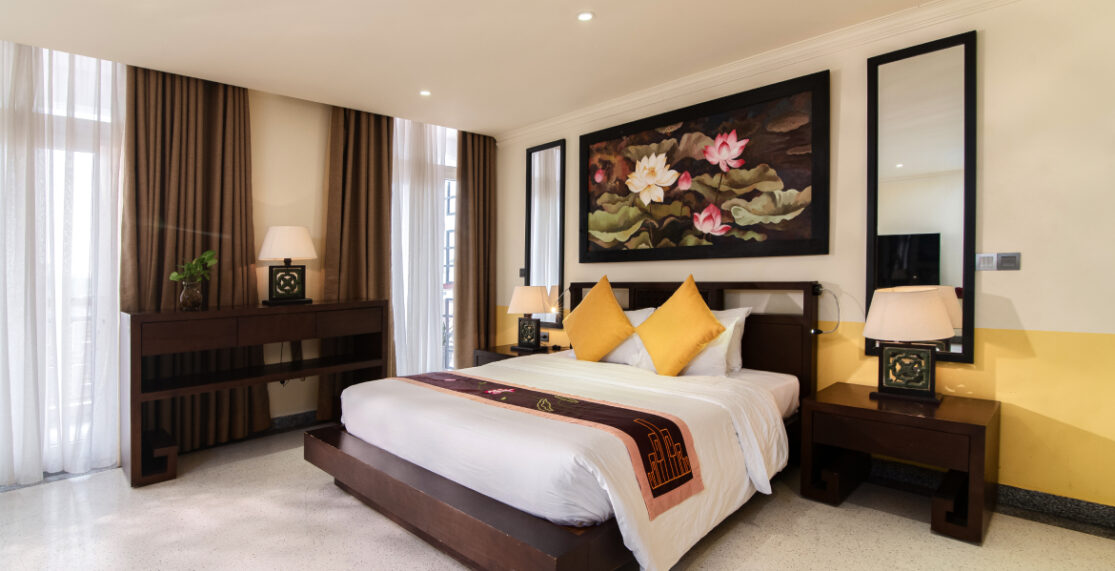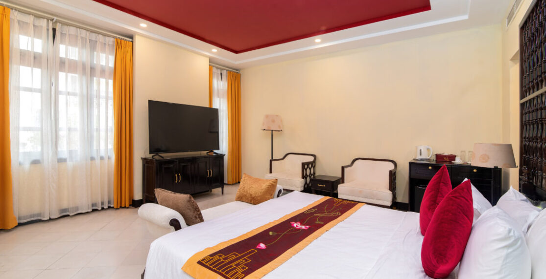 Phòng Royal Supperior Double mang phong cách trang nhã với điểm nhấn nghệ thuật truyền thống, tạo nên không gian ấm cúng và tinh tế. Giường đôi êm ái cùng gối màu vàng nổi bật, sofa tiếp khách và ánh sáng tự nhiên từ cửa sổ lớn giúp phòng luôn thoáng đãng, dễ chịu. Đây…