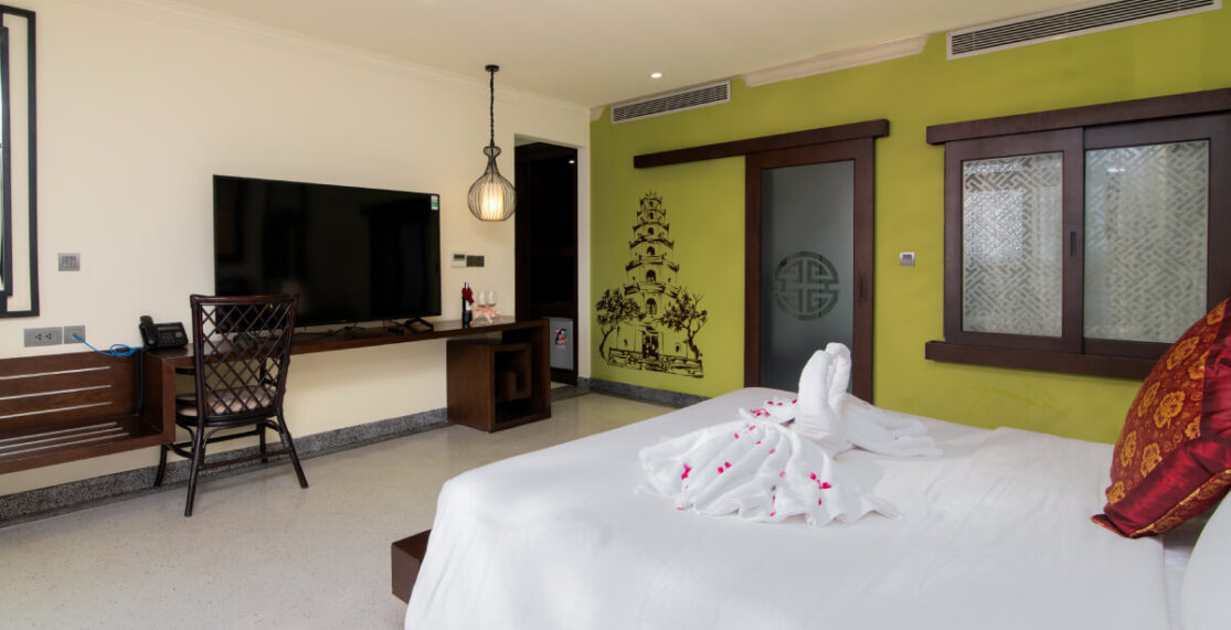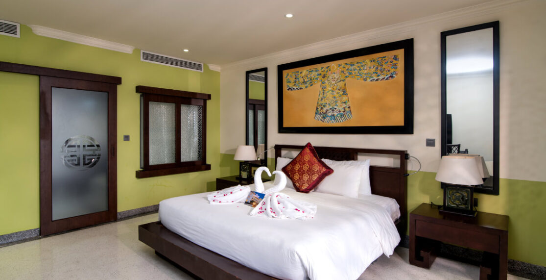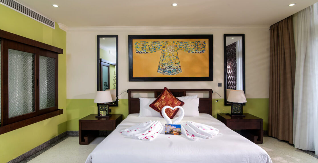 Phòng Villa Superior Double mang phong cách sang trọng kết hợp nét Á Đông tinh tế. Không gian rộng rãi với giường đôi êm ái, điểm nhấn là bức vách trang trí hoa văn cùng họa tiết truyền thống đầy nghệ thuật.