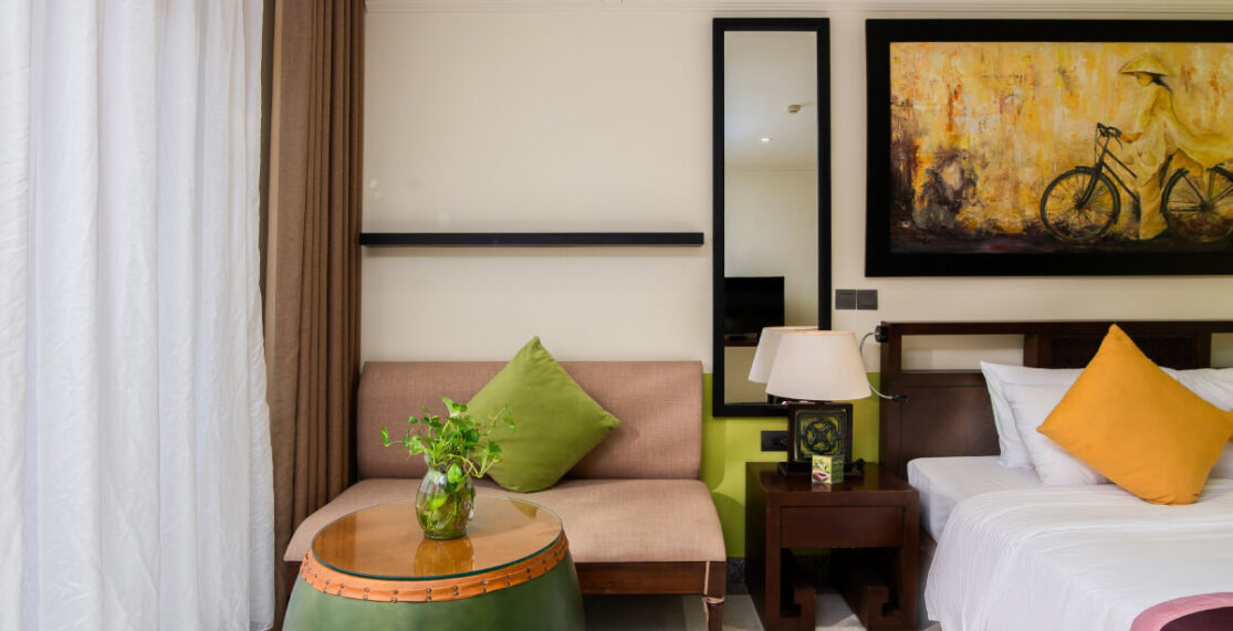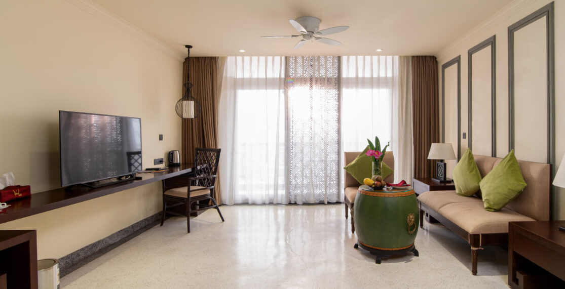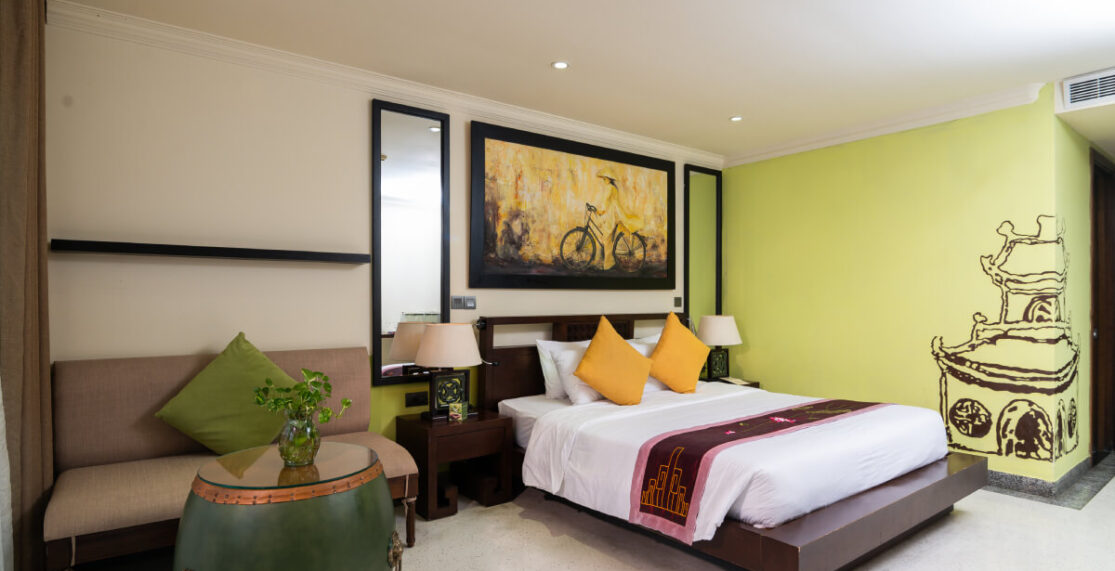 Phòng Royal Superior Twin mang phong cách trang nhã với điểm nhấn nghệ thuật truyền thống, tạo nên không gian ấm cúng và tinh tế. Giường đôi êm ái cùng gối màu vàng nổi bật, sofa tiếp khách và ánh sáng tự nhiên từ cửa sổ lớn giúp phòng luôn thoáng đãng, dễ chịu.