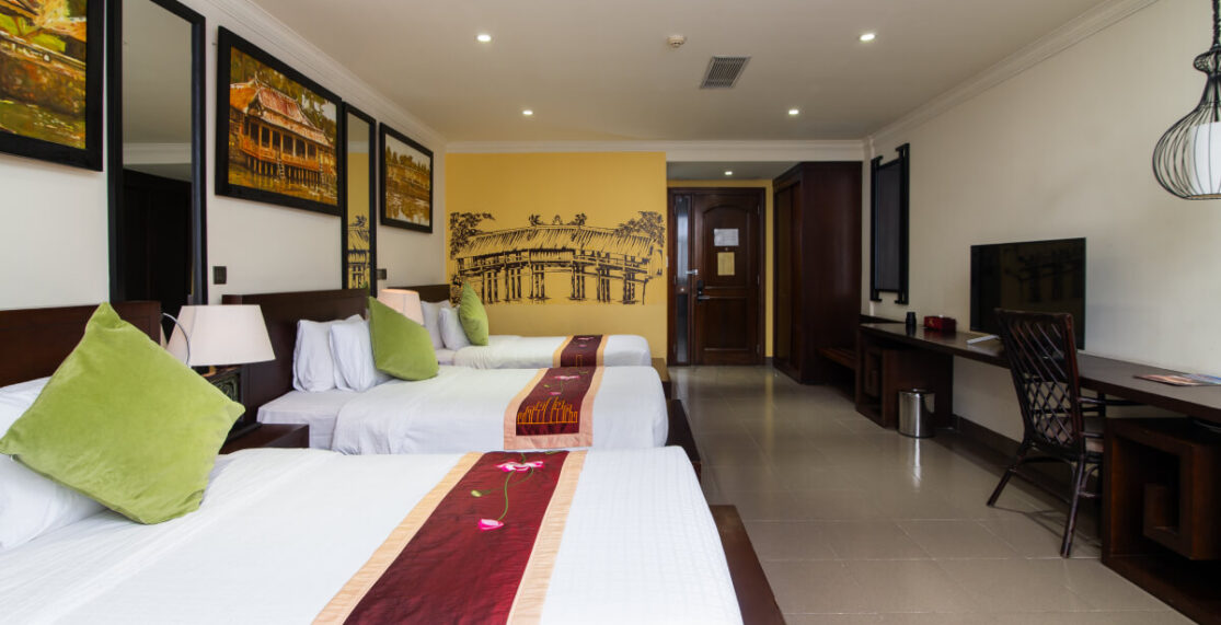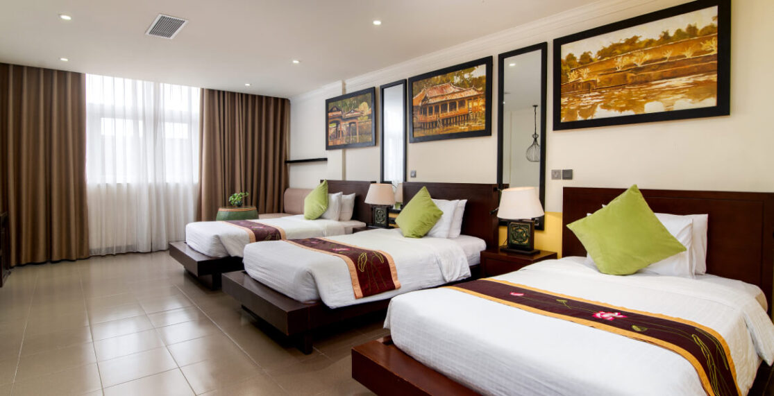 Phòng Royal Superior Triple được thiết kế rộng rãi và thoáng sáng, lý tưởng cho gia đình hoặc nhóm bạn. Với ba giường đơn êm ái, tông màu ấm áp và tranh treo mang đậm dấu ấn văn hóa Huế, không gian vừa sang trọng vừa gần gũi.
