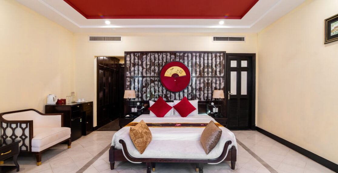 Phòng Villa Deluxe Double mang đến không gian rộng rãi với thiết kế tinh tế, nổi bật bởi trần đỏ sang trọng và điểm nhấn nghệ thuật truyền thống. Giường đôi êm ái được trang trí với gối đỏ nổi bật, kết hợp cùng nội thất gỗ tối màu tạo nên sự hài hòa, ấm…