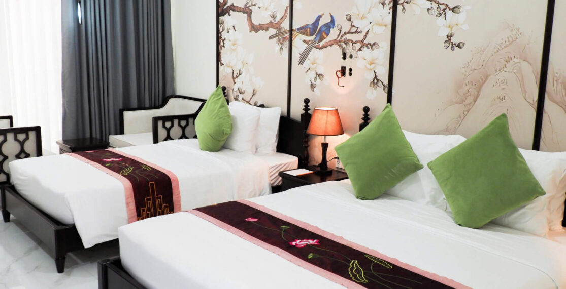 Phòng Harmony Superior Triple mang phong cách sang trọng kết hợp nét Á Đông tinh tế. Không gian rộng rãi với giường đôi êm ái, điểm nhấn là bức vách trang trí hoa văn cùng họa tiết truyền thống đầy nghệ thuật.