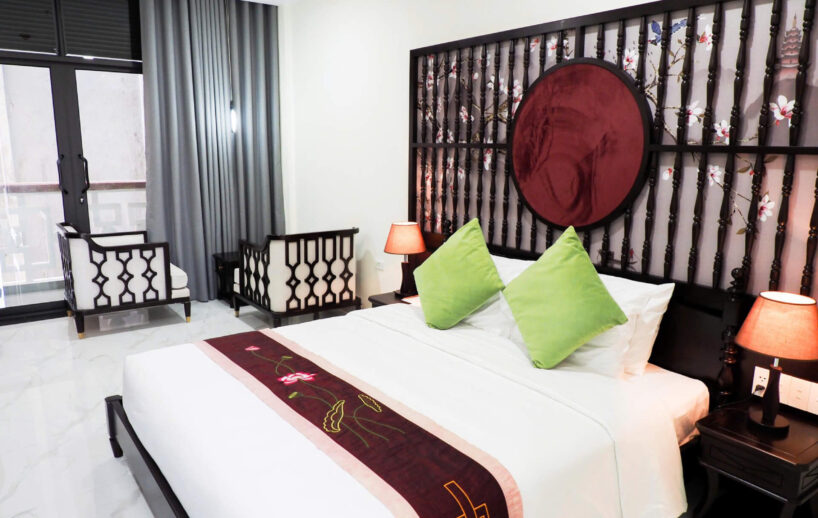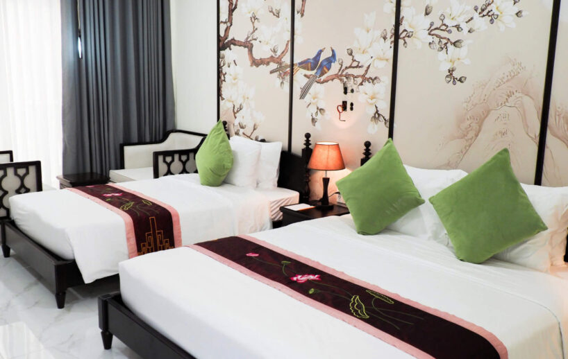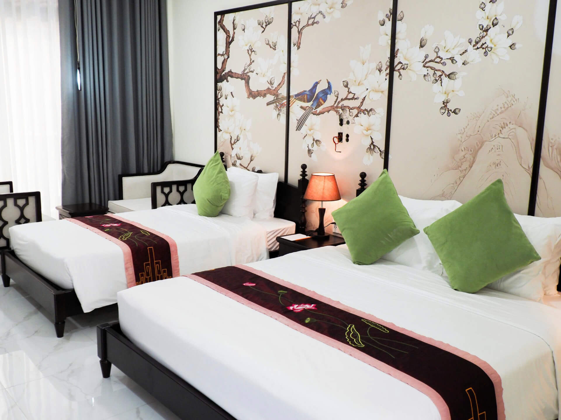 Phòng Villa Superior  Twin mang phong cách sang trọng kết hợp nét Á Đông tinh tế. Không gian rộng rãi với giường đôi êm ái, điểm nhấn là bức vách trang trí hoa văn cùng họa tiết truyền thống đầy nghệ thuật. Phòng còn được trang bị bàn làm việc, TV màn hình lớn, ghế sofa thư giãn và cửa sổ lớn đón ánh sáng tự nhiên, tạo nên không gian thoáng đãng và thoải mái. Đây là lựa chọn hoàn hảo cho kỳ nghỉ lãng mạn hoặc chuyến công tác đầy tiện nghi.
